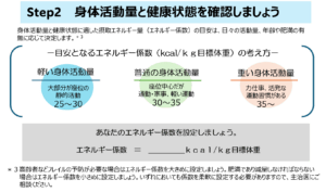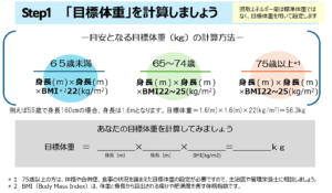 *成人期以降の適切な摂取エネルギー量は、以下のStep1(目標体重の計算)、Step2(エネルギー係数の確認)、Step3(1日の摂取エネルギー量の計算)にしたがって算出することができます。この摂取エネルギーを3で割った数字が一食分の目安です。